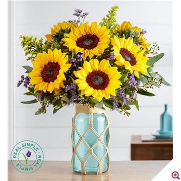 Sunflowers have a way of delivering sunshine and happiness—here in our new bouquet, designed in partnership with Real Simple. A trio of golden blooms are gathered with fresh purple limonium and greenery in our sea green glass jar, featuring a handmade macramé cover, adding to its simple yet stylish beauty. All-around arrangement with sunflowers and purple limonium; accented with assorted greenery Artistically designed in our Real Simple® Macramé Jar, inspired by repurposed glass and designed with a one-of-a-kind, eco-friendly, handmade macramé cover; measures 7.8"H x 4.5"D arrangement measures approximately 16.5"H x 11"WSunshine